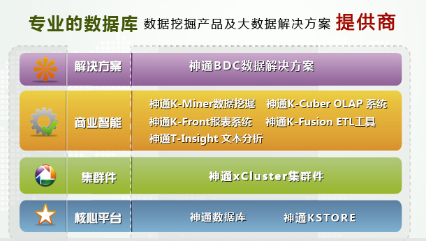 神舟通用公司主營業(yè)務(wù)主要包括神通關(guān)系型通用數(shù)據(jù)庫、神通KStore海量數(shù)據(jù)管理系統(tǒng)、神通xCluster集群件、神通商業(yè)智能套件等系列產(chǎn)品研發(fā)和市場(chǎng)銷售;诋a(chǎn)品組合,可形成支持交易處理、MPP數(shù)據(jù)庫集群、數(shù)據(jù)分析與處理等解決方案。公司擁有40余名實(shí)戰(zhàn)經(jīng)驗(yàn)豐富的中高級(jí)數(shù)據(jù)庫技術(shù)服務(wù)人員,可提供數(shù)據(jù)庫系統(tǒng)調(diào)優(yōu)和運(yùn)維服務(wù)。公司客戶主要覆蓋政府、電信、能源、交通、網(wǎng)安、國防和軍工等領(lǐng)域,率先實(shí)現(xiàn)國產(chǎn)數(shù)據(jù)庫在電信行業(yè)的大規(guī)模商用。